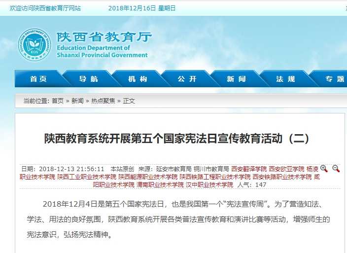 2018年12月4日是第五个国家宪法日,也是我国第一个“宪法宣传周”。为了营造知法、学法、用法的良好氛围,陕西教育系统开展各类普法宣传教育和演讲比赛等活动,增强师生的宪法意识,弘扬宪法精神。
