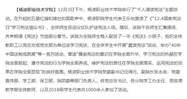 【杨凌职业技术学院】12月3日下午,杨凌职业技术学院举行了“千人诵读宪法”主题活动。在升起的五星红旗和雄壮的国歌声中,杨凌职院学生代表王乐怡宣读了《“12.4国家宪法日”学习宪法倡议书》,全体师生目迎仪仗队护送宪法入场。随后,该院千名师生汇集操场,齐声朗诵《宪法》节选部分章节。该院为全院师生每人配发了一本《宪法》小册子,组织全体教职工以党总支或党支部为单位进学习宪法,在全体学生中开展“晨读宪法”活动,举办“40年中国法制成就展”等一系列活动,营造“尊崇宪法的意识在学院全面升华、学习宪法的热潮在学院全面掀起、遵守宪法的行为学院全面养成、维护宪法的责任在学院全面落实、运用宪法的效果在学院全面显现”的良好氛围。杨凌职业技术学院党委副书记任得元、副院长张永良,党委宣传部、学工部、保卫部、院团委等部门负责人,各党总支书记、各分院学工办主任、思政课教学部全体教师,以及2018级学生代表共1000余人参加了活动。