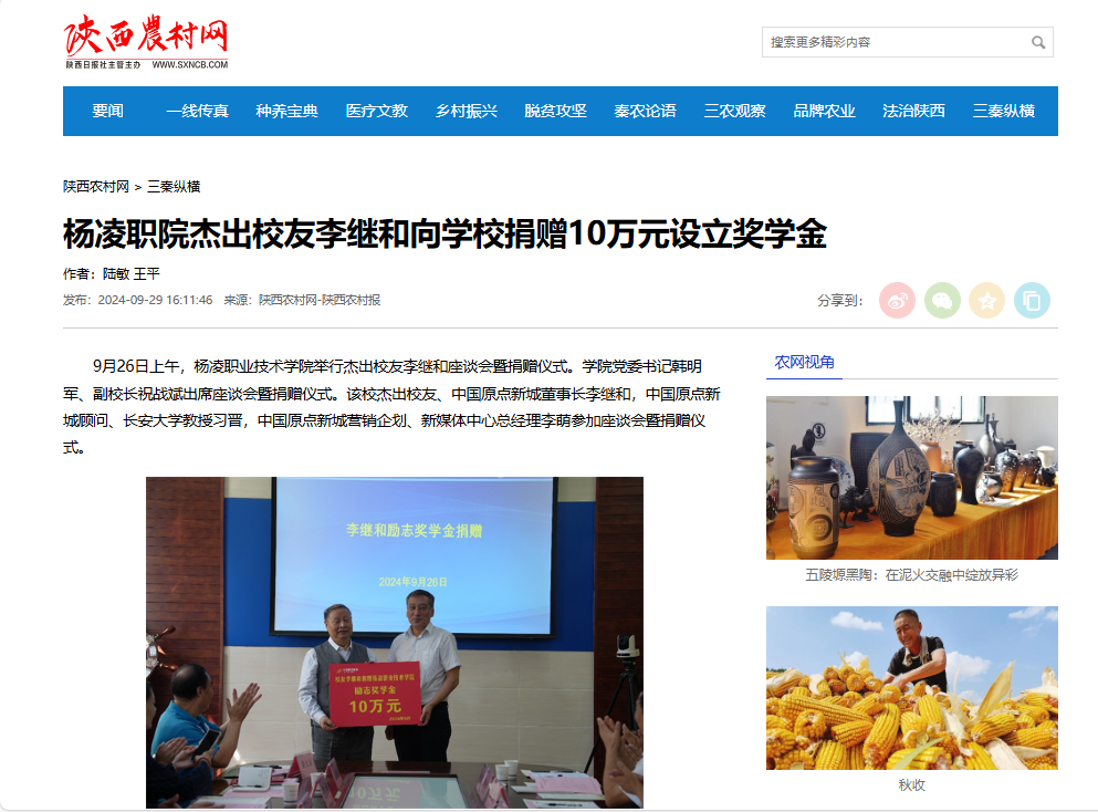 【陕西农村网】杨凌职院杰出校友李继和向学校捐赠10万元设立奖学金
