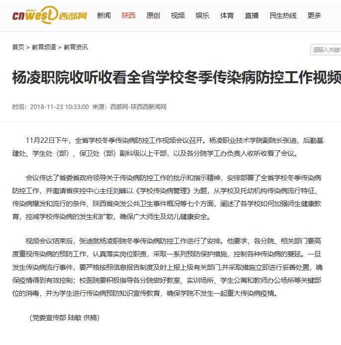 视频会议结束后,张迪就杨凌职院冬季传染病防控工作进行了安排。他要求,各分院、相关部门要高度重视传染病的预防工作,认真落实岗位职责,采取一系列预防保护措施,控制各种传染病的蔓延。一旦发生传染病流行事件,要严格按照信息报告制度及时上报上级有关部门,并采取措施立即进行妥善处置,确保疫情得到有效控制;校医院要积极指导各分院做好教室、实训场所、学生公寓和教师办公场所等关键部位的消毒,并为学生进行传染病预防知识宣传教育,确保学院不发生一起重大传染病疫情。