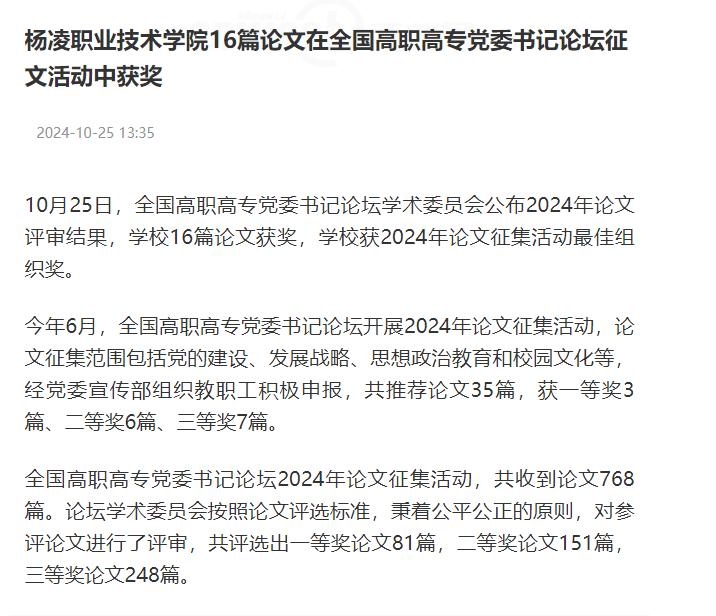 1025日,全国高职高专党委书记论坛学术委员会公布2024年论文评审结果,学校16篇论文获奖,学校获2024年论文征集活动最佳组织奖。