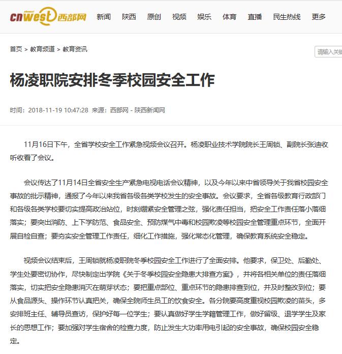 11月16日下午,全省学校安全工作紧急视频会议召开。杨凌职业技术学院院长王周锁、副院长张迪收听收看了会议。