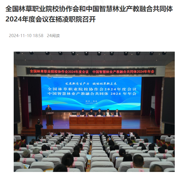 2024年11月8日至9日,由国家林业和草原局林草职业教育研究中心、中国林业教育学会职业教育分会主办,杨凌职业学院承办的全国林草职业院校协作会2024年度会议暨新质生产力赋能现代林草行业高质量发展研讨会、中国智慧林业产教融合共同体2024年年会暨新质生产力赋能智慧林业人才培养高质量发展研讨会在杨凌职业技术学院召开。本次年会的主题为“加快发展林草行业新质生产力,扎实推进林草职业教育高质量发展”。