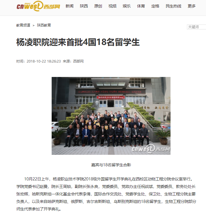 据悉,为积极响应国家“一带一路”倡议、加快学院的教育国际化进程、提升学院的办学水平,从今年起,杨凌职院开始招收外留学生来校进行语言和专业学习。此次首批来校学习的国外留学生来自哈萨克斯坦、俄罗斯、吉尔吉斯斯坦、乌斯别克斯坦4个国家,共18名。其中,12名学习“现代生物技术”专业,为期3年;6名学习汉语语言,为期1年。本学年18名留学生共同学习汉语语言,课程包括初级读写、初级听力、初级综合、初级口语和HSK标准教程等。