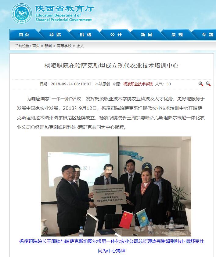 为响应国家“一带一路”倡议,发挥杨凌职业技术学院农业科技及人才优势,更好地服务于发展中国家农业发展,2018年9月12日,杨凌职院哈萨克斯坦现代农业技术培训中心在哈萨克斯坦阿拉木图州图尔根尼区挂牌成立。杨凌职院院长王周锁与哈萨克斯坦图尔根尼一体化农业公司总经理热克谢姆别科娃·满舒克共同为中心揭牌。
