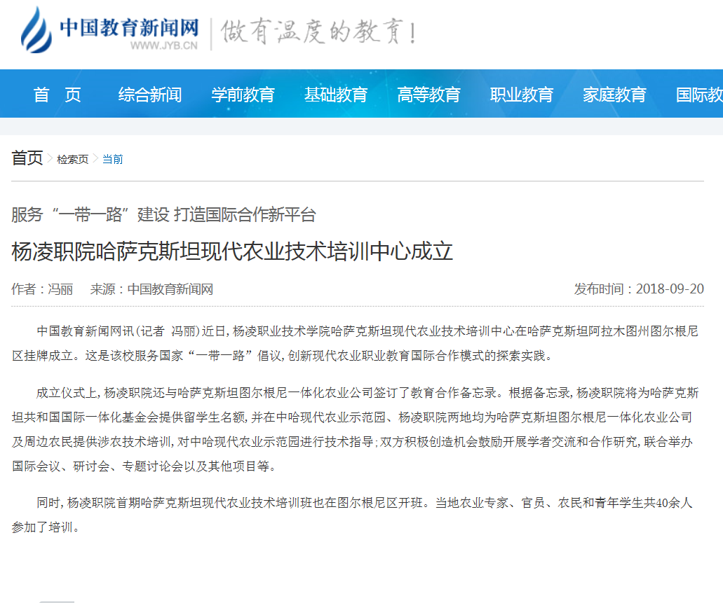 【中国教育新闻网】杨凌职院哈萨克斯坦现代农业技术培训中心成立