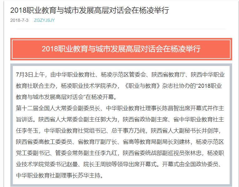 7月3日上午,由中华职业教育社、杨凌示范区管委会、陕西省教育厅、陕西中华职业教育社联合主办,杨凌职业技术学院承办,《职业与教育》杂志社协办的“2018职业教育与城市发展高层对话会”在杨凌开幕。