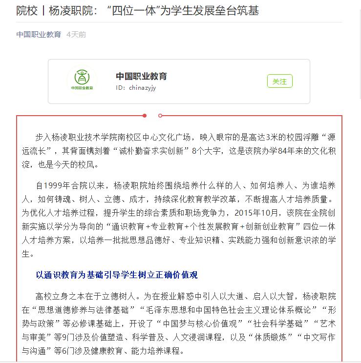 自1999年合院以来,杨凌职院始终围绕培养什么样的人、如何培养人、为谁培养人,如何铸魂、树人、立德、成才,持续深化教育教学改革,不断提高人才培养质量。为优化人才培养过程,提升学生的综合素质和职场竞争力,2015年10月,该院在全院创新实施以学分为导向的“通识教育+专业教育+个性发展教育+创新创业教育”四位一体人才培养方案,以培养一批批思想品德好、专业知识精、实践能力强和创新意识浓的学生。