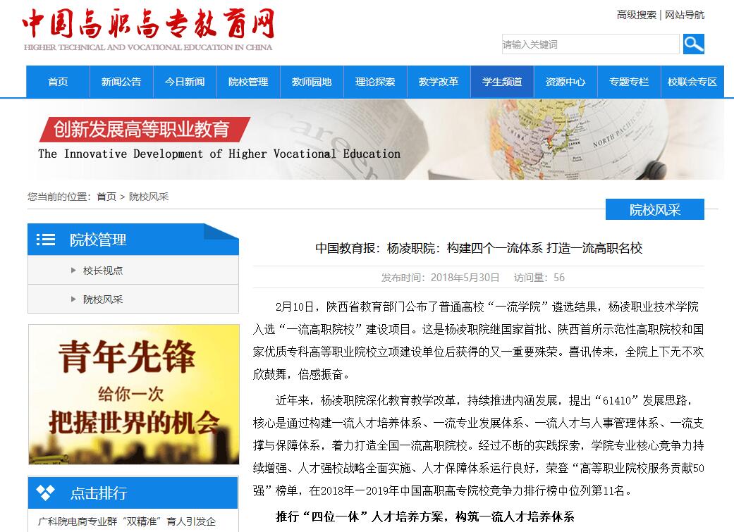 近年来,杨凌职院深化教育教学改革,持续推进内涵发展,提出“61410”发展思路,核心是通过构建一流人才培养体系、一流专业发展体系、一流人才与人事管理体系、一流支撑与保障体系,着力打造全国一流高职院校。经过不断的实践探索,学院专业核心竞争力持续增强、人才强校战略全面实施、人才保障体系运行良好,荣登“高等职业院校服务贡献50强”榜单,在2018年—2019年中国高职高专院校竞争力排行榜中位列第11名。