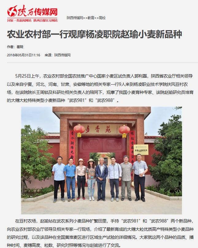 5月25日上午,农业农村部全国农技推广中心国家小麦区试负责人郭利磊,陕西省农业厅相关领导以及来自宁夏、河北、河南、甘肃、安徽等地的相关专家一行9人来到杨凌职业技术学院扶风豆村农场,在该院院长王周锁及科研处相关负责人的陪同下,观摩了我国小麦育种专家、该院赵瑜研究员培育的大穗大粒特殊类型小麦新品种“武农981”和“武农988”。