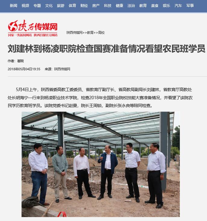 5月4日上午,陕西省委高教工委委员、省教育厅副厅长、省高教局副局长刘建林,省教育厅高教处处长胡海宁一行来到杨凌职业技术学院,检查2018年全国职业院校技能大赛准备情况,并看望了该院农民学历教育班学员。该院党委书记赵曼,院长王周锁,副院长张永良等陪同检查。