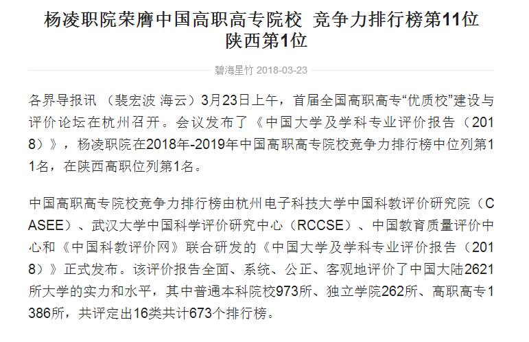 各界导报讯 (裴宏波 海云)3月23日上午,首届全国高职高专“优质校”建设与评价论坛在杭州召开。会议发布了《中国大学及学科专业评价报告(2018)》,杨凌职院在2018年-2019年中国高职高专院校竞争力排行榜中位列第11名,在陕西高职位列第1名。