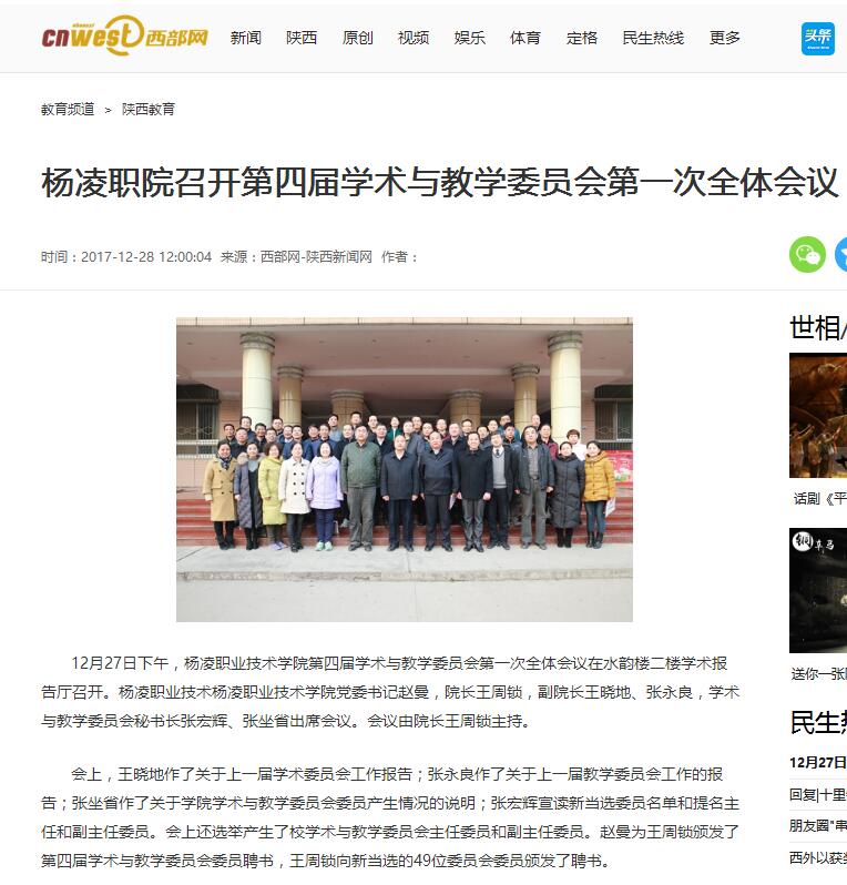 12月27日下午,杨凌职业技术学院第四届学术与教学委员会第一次全体会议在水韵楼二楼学术报告厅召开。杨凌职业技术杨凌职业技术学院党委书记赵曼,院长王周锁,副院长王晓地、张永良,学术与教学委员会秘书长张宏辉、张坐省出席会议。会议由院长王周锁主持。