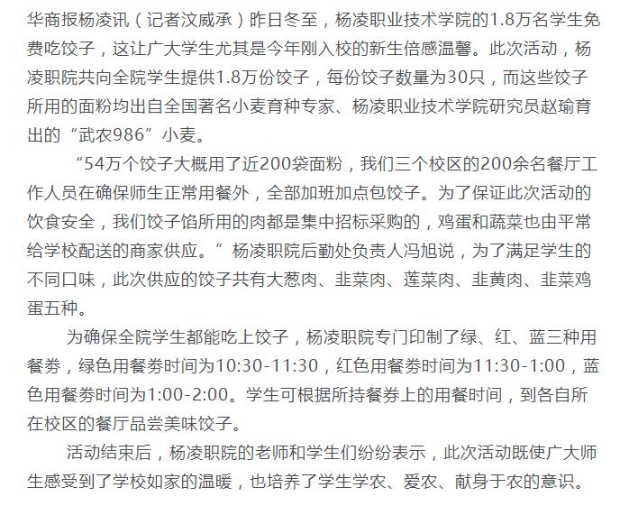 【华商报】杨凌职院1.8万名学生免费吃饺子
