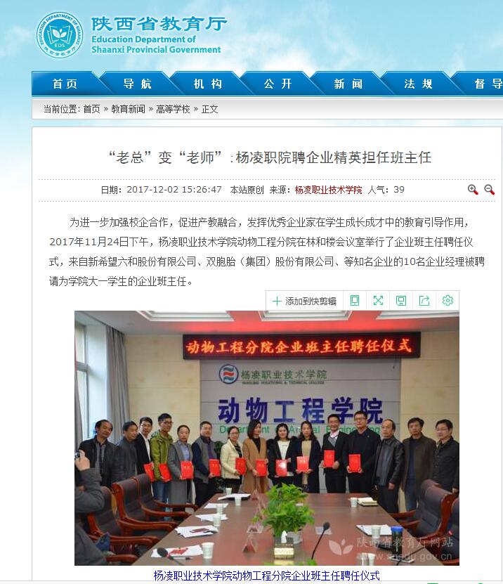 为进一步加强校企合作,促进产教融合,发挥优秀企业家在学生成长成才中的教育引导作用,2017年11月24日下午,杨凌职业技术学院动物工程分院在林和楼会议室举行了企业班主任聘任仪式,来自新希望六和股份有限公司、双胞胎(集团)股份有限公司、等知名企业的10名企业经理被聘请为学院大一学生的企业班主任。