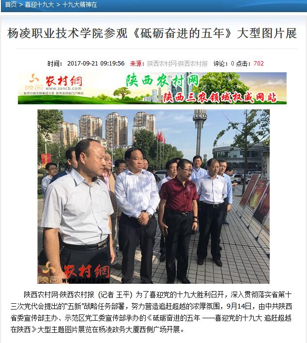 9月19日上午,杨凌职业技术学院党委书记赵曼,院长王周锁带领各分院领导干部观看了展览,他们一行一边聆听工作人员的精彩讲解,一边不停地用手机拍下展板内容。时而驻足凝神思考,时而与大家交流分享所悟所感。