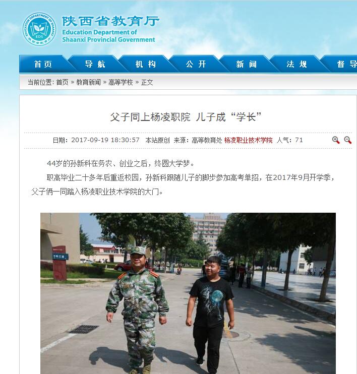 【陕西省教育厅】父子同上杨凌职院 儿子成“学长”