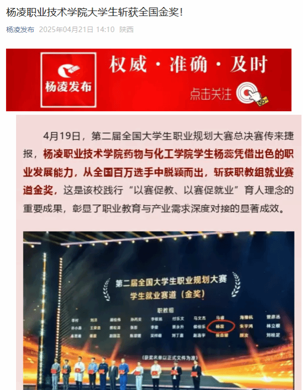 4月19日,第二届全国大学生职业规划大赛总决赛传来捷报,杨凌职业技术学院药物与化工学院学生杨蕊凭借出色的职业发展能力,从全国百万选手中脱颖而出,斩获职教组就业赛道金奖,这是学校践行“以赛促教、以赛促就业”育人理念的重要成果,彰显了职业教育与产业需求深度对接的显著成效。