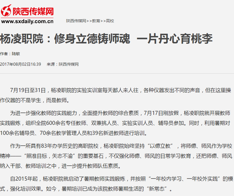 作为一所具有83年办学历史的高职院校,杨凌职院始终坚持“以德立教”,将师德、师风作为学校精神——“照准目标,矢志不渝”的重要基石,不仅强化师德、师风的日常学习教育,还把师德、师风纳入干部、教师培训之中,进一步提升教师队伍素质。