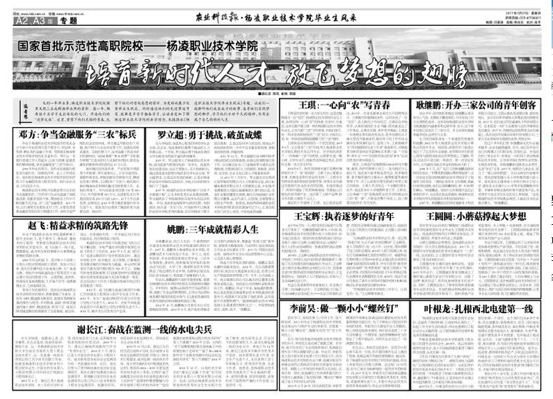 编者按:又到一年毕业季,杨凌职业技术学院校园里又现三五成群拍毕业照的身影。每一年,都有数千名学子走出母校的大门,开启他们的“逐梦之旅”。这里,曾留下他们无悔的青春,也留下他们对母校感恩的情怀。为更好地展示优秀毕业生风采,同时通过他们的先进事迹号召、鼓舞更多学子勤奋学习,让读者更加了解杨凌职业技术学院的办学理念,本报推出《杨凌职业技术学院毕业生风采》专题。让我们一起聆听他们成长成才的故事,追寻他们实现梦想的脚步,学习他们不甘平凡的精神,书写出属于自己的精彩人生。