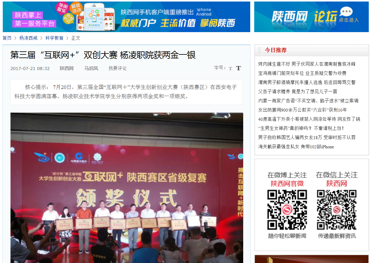 【陕西网】第三届“互联网+”双创大赛 杨凌职院获两金一银