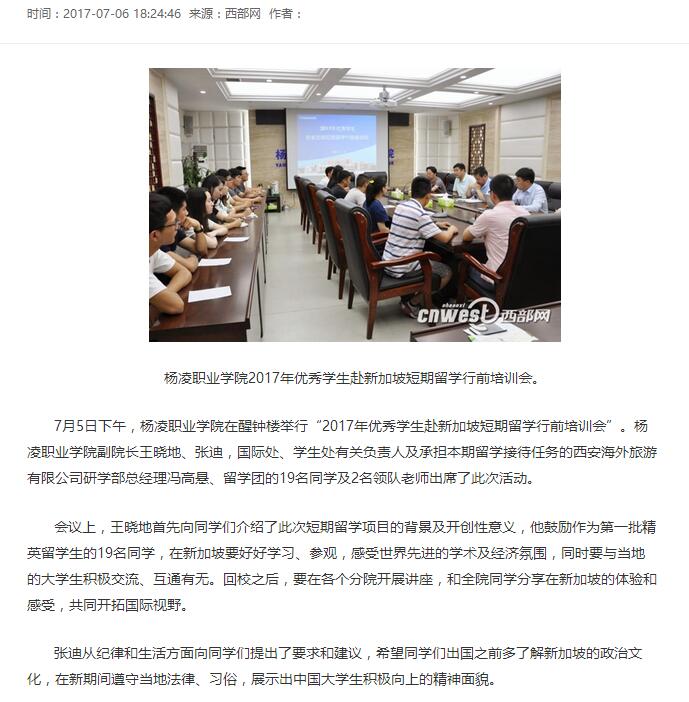 7月5日下午,杨凌职业学院在醒钟楼举行“2017年优秀学生赴新加坡短期留学行前培训会”。杨凌职业学院副院长王晓地、张迪,国际处、学生处有关负责人及承担本期留学接待任务的西安海外旅游有限公司研学部总经理冯高悬、留学团的19名同学及2名领队老师出席了此次活动。