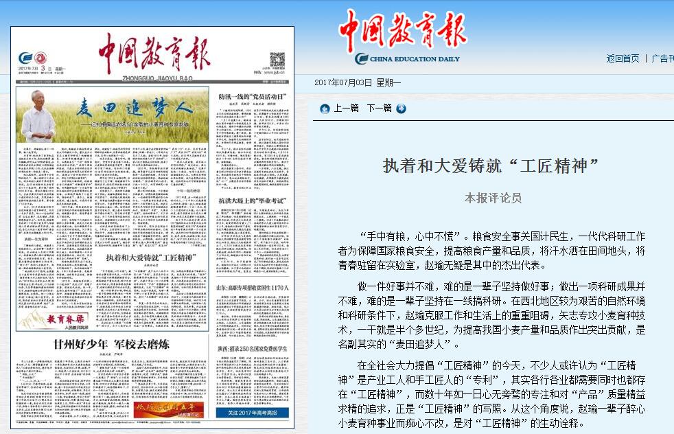 在全社会大力提倡“工匠精神”的今天,不少人或许认为“工匠精神”是产业工人和手工匠人的“专利”,其实各行各业都需要同时也都存在“工匠精神”,而数十年如一日心无旁骛的专注和对“产品”质量精益求精的追求,正是“工匠精神”的写照。从这个角度说,赵瑜一辈子醉心小麦育种事业而痴心不改,是对“工匠精神”的生动诠释。