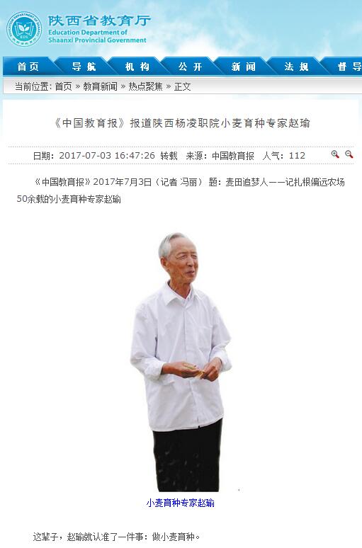 《中国教育报》2017年7月3日(记者 冯丽) 题:麦田追梦人——记扎根偏远农场50余载的小麦育种专家赵瑜