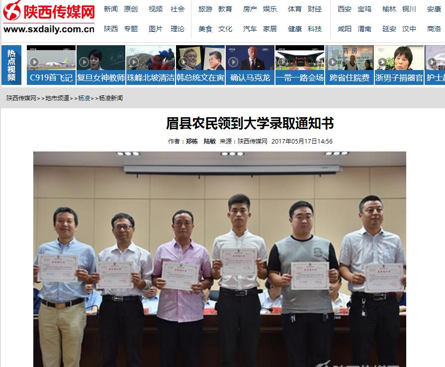 5月16日下午,来自眉县槐芽、金渠、首善、横渠等镇办的50多名农民领到了由杨凌职业技术学院颁发的大学录取通知书。据了解,这些农民“准大学生”都是眉县的职业农民或村干部,他们是通过自主招生考试考入杨凌职业技术学院职业农民大专班的。今年9月,他们将进入杨凌职业技术学院,接受系统正规的现代农业全日制学历教育。 陕西日报记者 郑栋 通讯员 陆敏