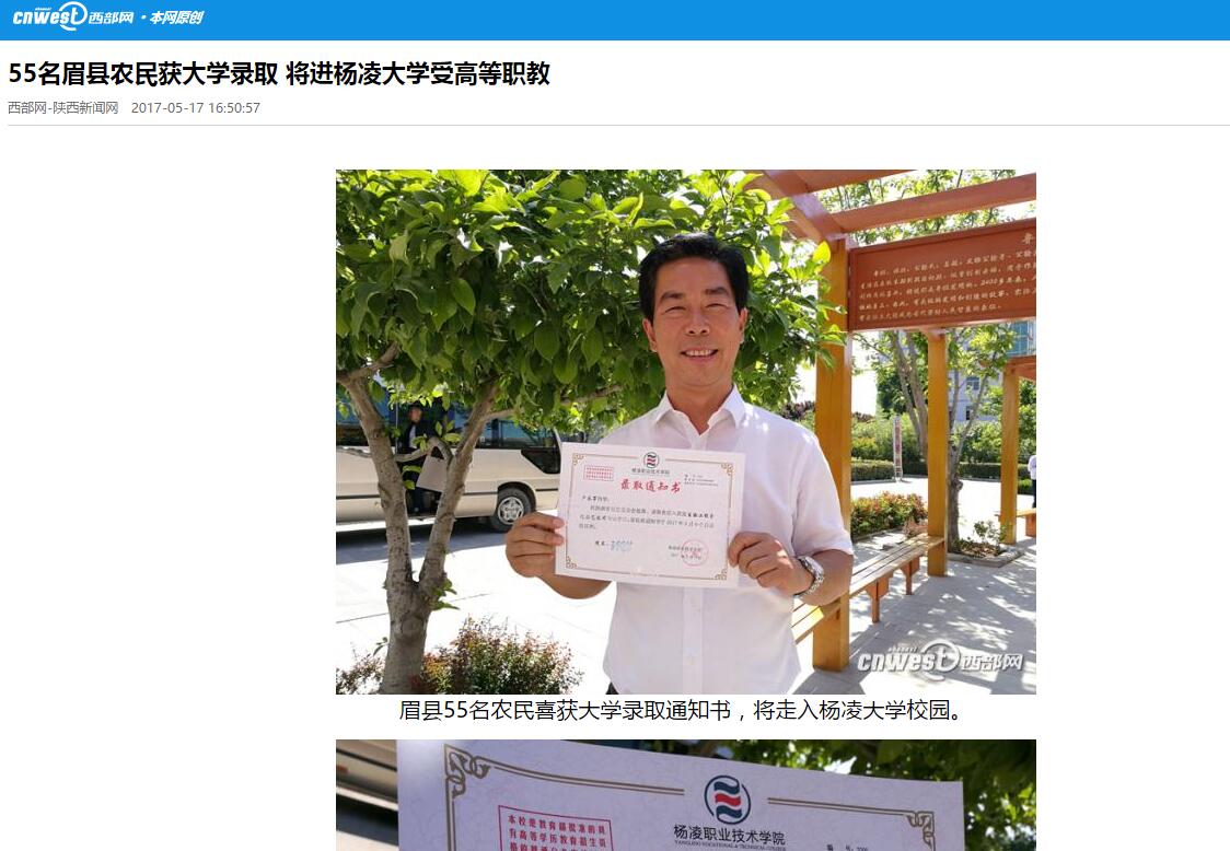 西部网讯(陕西广播电视台新闻中心 记者 徐鑫)杨凌职业技术学院职业农民培育学院5月16号分别在周至和眉县挂牌成立,来自眉县的55名农民获得了杨凌职业技术学院颁发的录取通知书,他们将在今年九月走进大学校园,接受为期三年的全日制高等职业教育。
