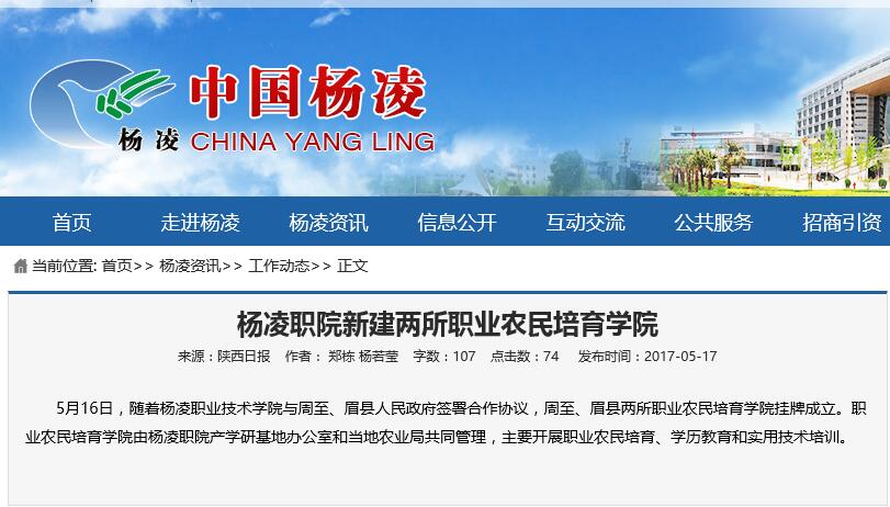 5月16日,随着杨凌职业技术学院与周至、眉县人民政府签署合作协议,周至、眉县两所职业农民培育学院挂牌成立。职业农民培育学院由杨凌职院产学研基地办公室和当地农业局共同管理,主要开展职业农民培育、学历教育和实用技术培训。