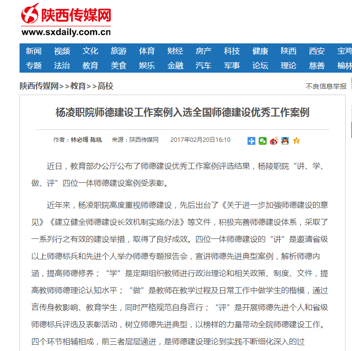 近日,教育部办公厅公布了师德建设优秀工作案例评选结果,杨陵职院“讲、学、做、评”四位一体师德建设案例受表彰。
