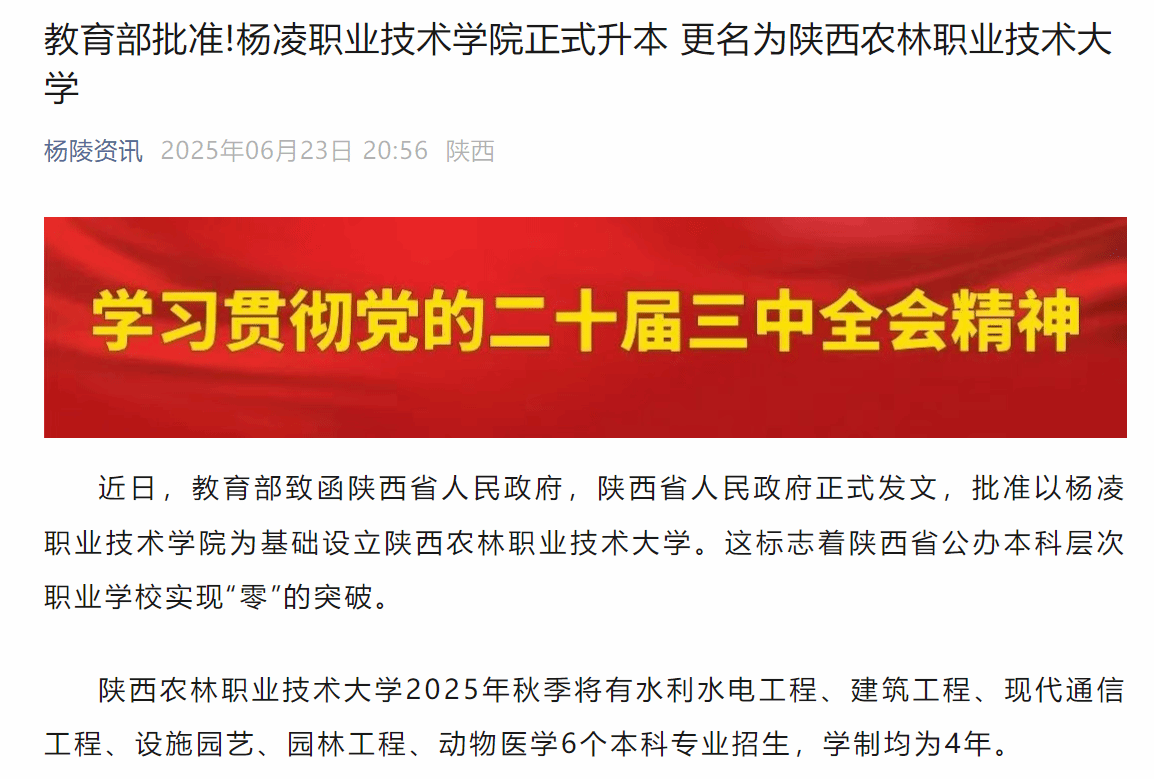 【杨陵资讯】教育部批准!杨凌职业技术学院正式升本 更名为365官网