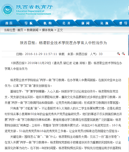 《陕西日报》20161129日(通讯员 裴红波 记者 郑栋)题:杨凌职业技术学院在办学育人中担当作为