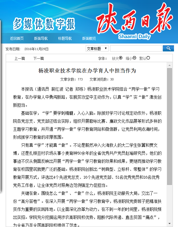 1129日,陕西日报头版报道了我院结合“两学一做”学习教育,在办学育人中的相关举措。 【详情点击】