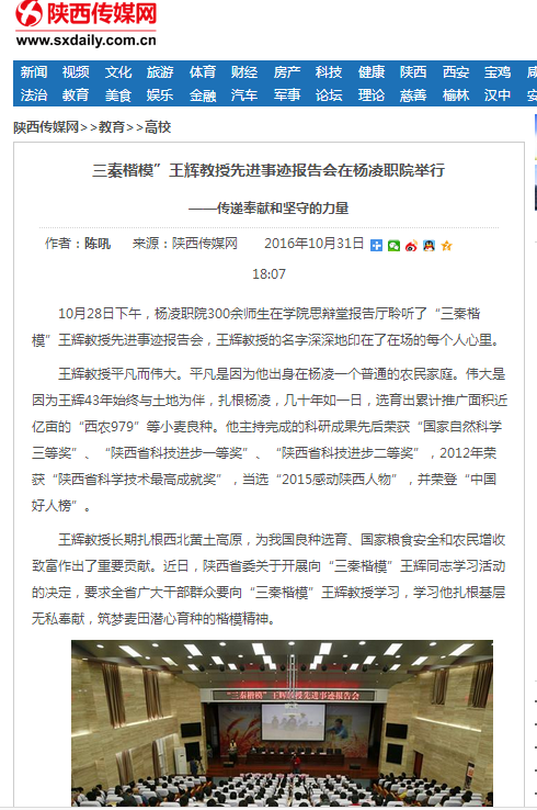 【陕西传媒网】”三秦楷模“王辉教授先进事迹报告会在杨凌职院举行