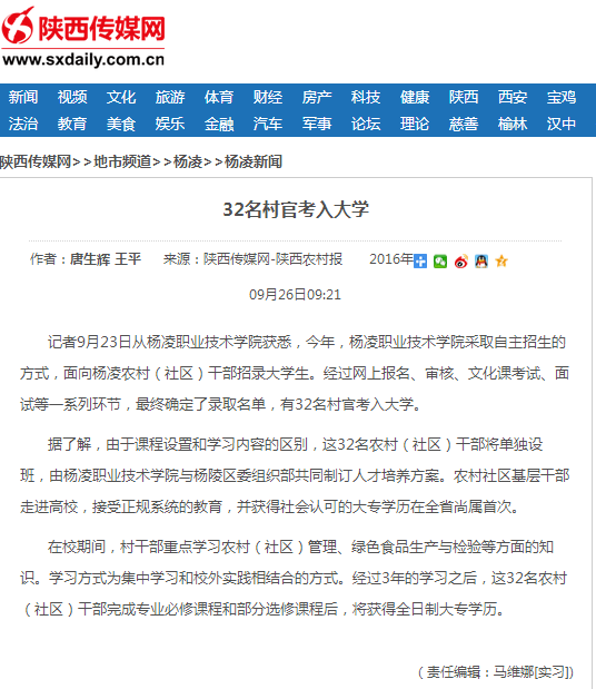 记者9月23日从杨凌职业技术学院获悉,今年,杨凌职业技术学院采取自主招生的方式,面向杨凌农村(社区)干部招录大学生。经过网上报名、审核、文化课考试、面试等一系列环节,最终确定了录取名单,有32名村官考入大学。