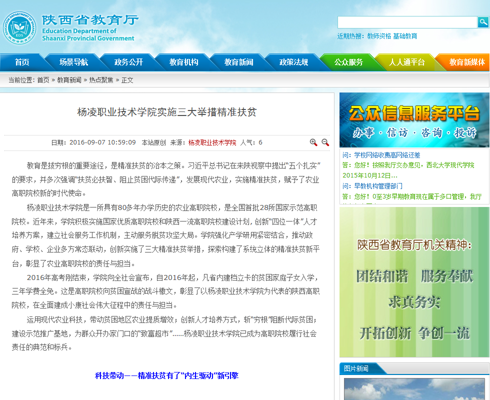 9月7日,陕西省教育厅网“热点聚焦”栏目,报道了我院实施三大举措,开展精准扶贫工作(详情进入)。