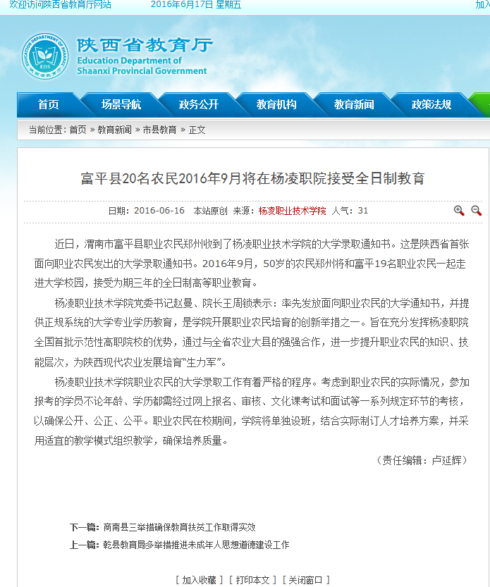 【陕西省教育厅】富平县20名农民将在杨凌职院接受全日制教育