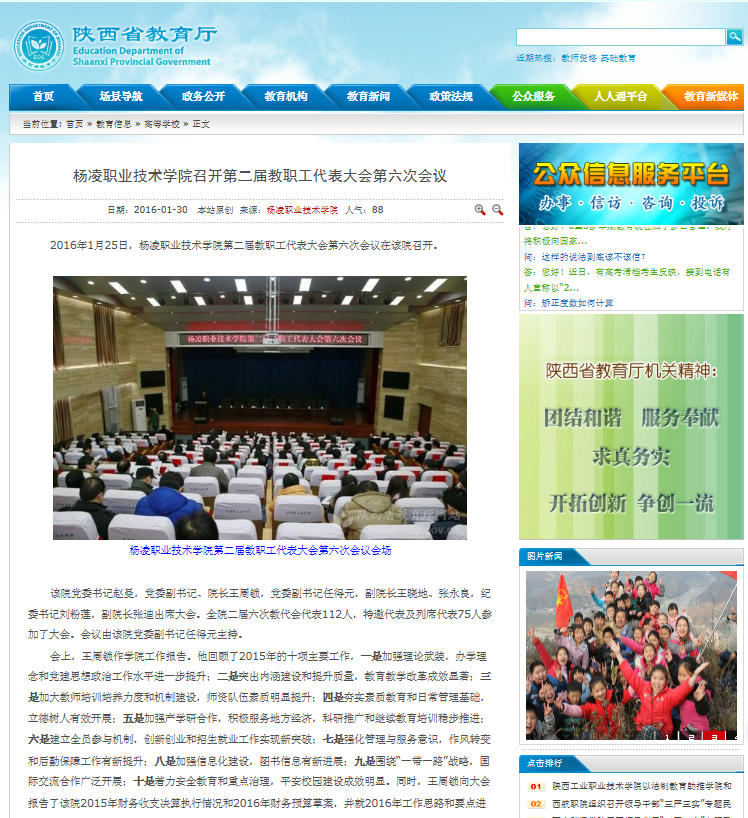 2016125日,杨凌职业技术学院第二届教职工代表大会第六次会议在该院召开。