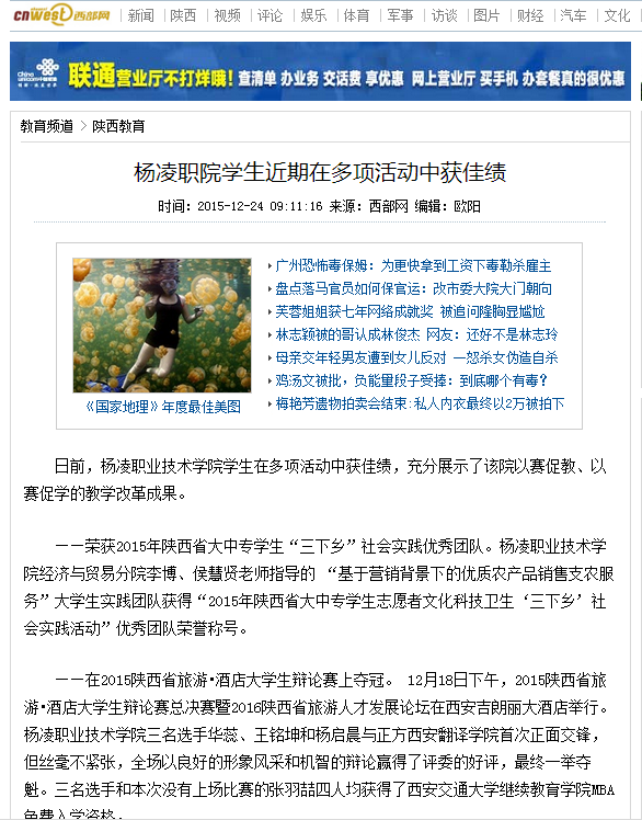 ——在2015陕西省旅游•酒店大学生辩论赛上夺冠。 12月18日下午,2015陕西省旅游•酒店大学生辩论赛总决赛暨2016陕西省旅游人才发展论坛在西安吉朗丽大酒店举行。杨凌职业技术学院三名选手华蕊、王铭坤和杨启晨与正方西安翻译学院首次正面交锋,但丝毫不紧张,全场以良好的形象风采和机智的辩论赢得了评委的好评,最终一举夺魁。三名选手和本次没有上场比赛的张羽喆四人均获得了西安交通大学继续教育学院MBA免费入学资格。