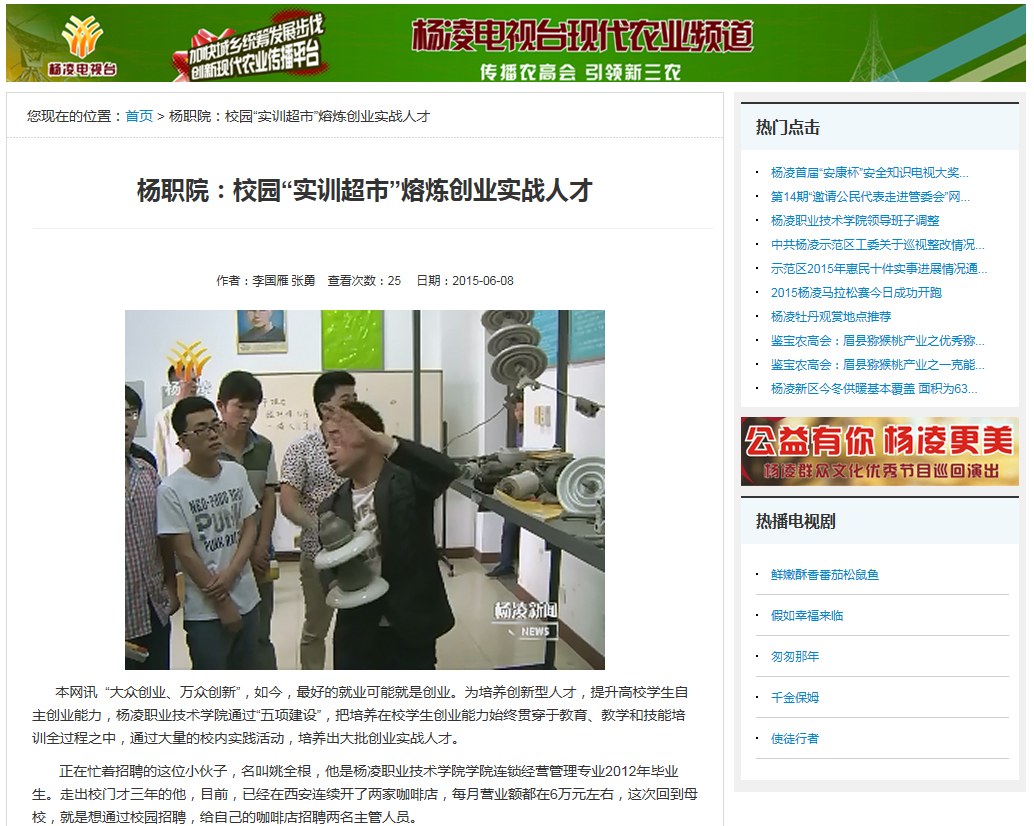 68日,杨凌电视台以“杨职院:校园‘实训超市’熔炼创业实战人才”为题,对我院学生创业工作进行了宣传报道(详情进入)