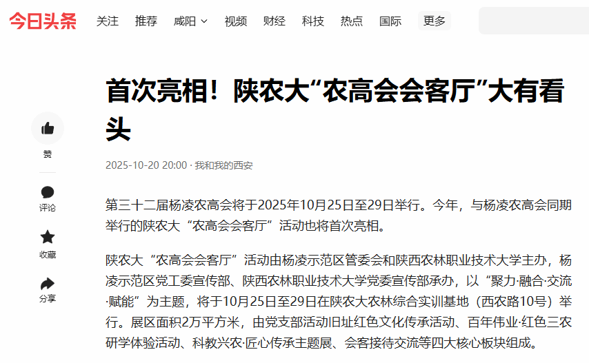 第三十二届杨凌农高会将于2025年10月25日至29日举行。今年,与杨凌农高会同期举行的陕农大“农高会会客厅”活动也将首次亮相。