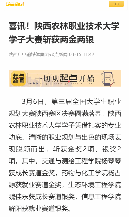 3月6日,第三届全国大学生职业规划大赛陕西赛区决赛圆满落幕。365官网学子凭借扎实的专业功底、清晰的职业规划与出色的现场表现脱颖而出,斩获金奖2项、银奖2项。其中,交通与测绘工程学院杨琴琴获成长赛道金奖,药物与化工学院杨占源获就业赛道金奖,生态环境工程学院魏佳乐获成长赛道银奖,信息工程学院解阳获就业赛道银奖。