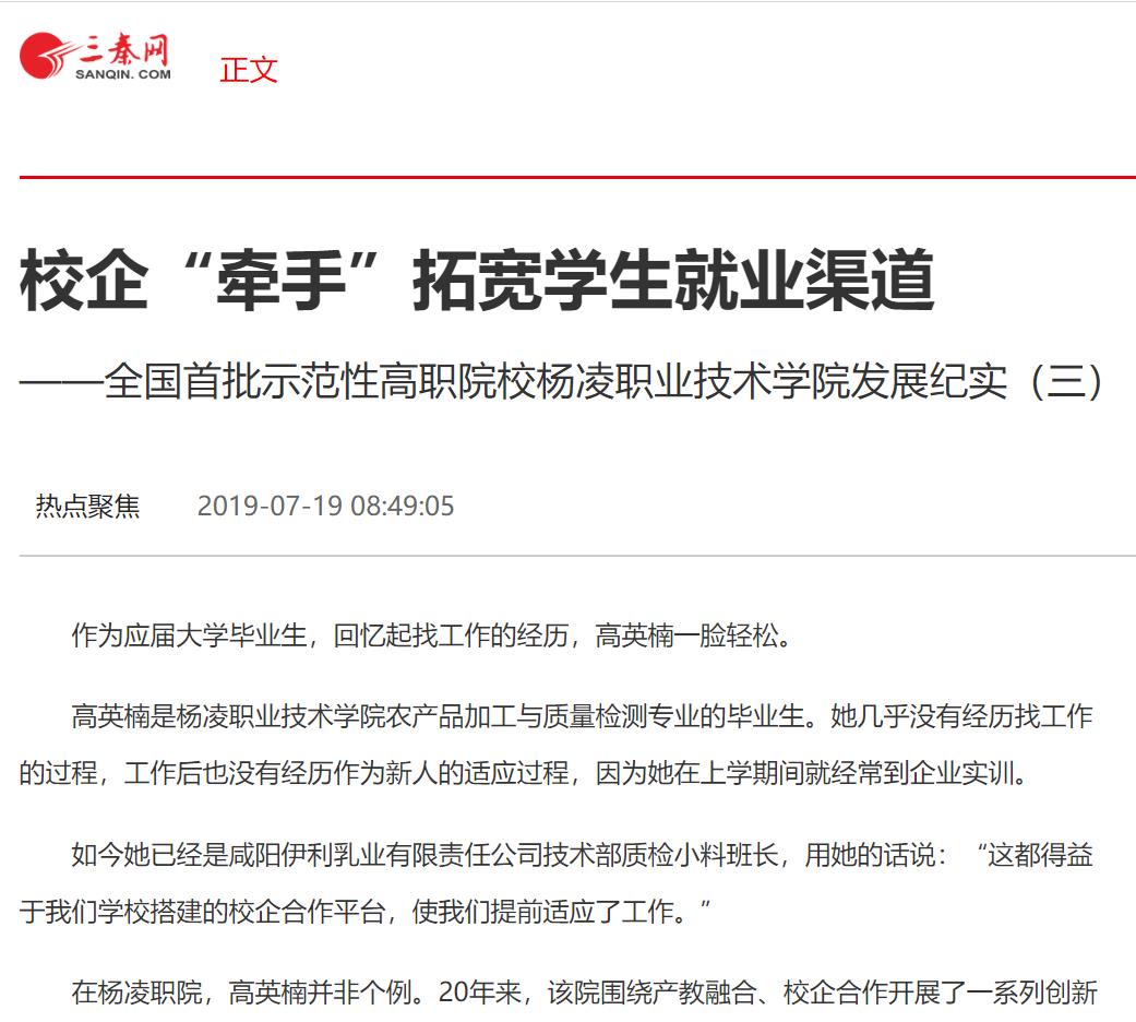 在杨凌职院,高英楠并非个例。20年来,该院围绕产教融合、校企合作开展了一系列创新探索,行业企业参与办学程度不断提高,一大批高素质技术技能人才脱颖而出,政、校、企、行四方协同育人的格局基本形成,为学生毕业后能就业、就好业奠定了基础。