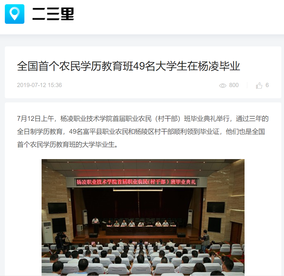 7月12日上午,杨凌职业技术学院首届职业农民(村干部)班毕业典礼举行,通过三年的全日制学历教育,49名富平县职业农民和杨陵区村干部顺利领到毕业证,他们也是全国首个农民学历教育班的大学毕业生。