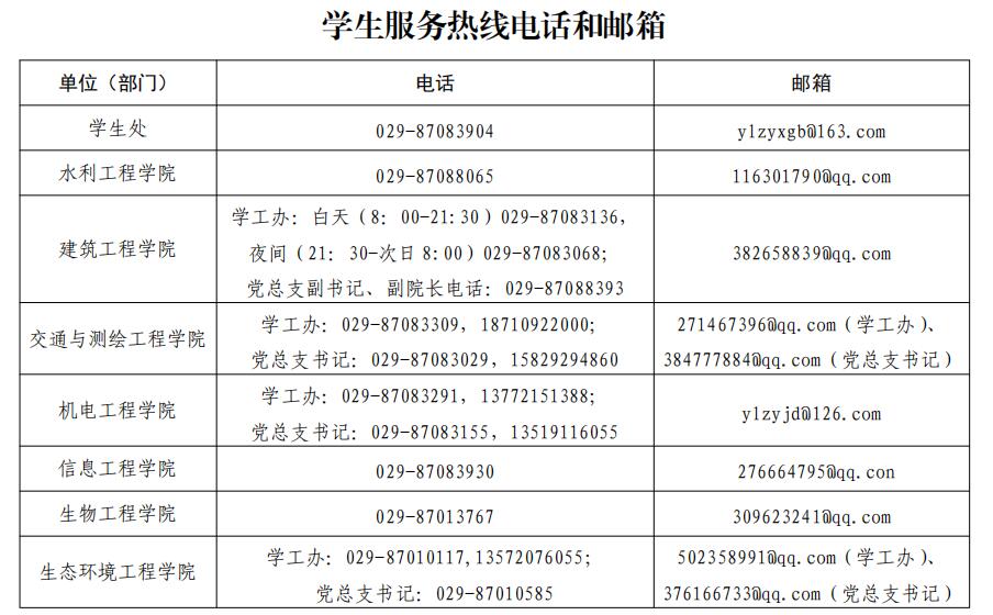为进一步提升疫情防控期间学生服务水平,确保学生高质量的校园生活,现将学生处、各二级学院和党委(校长)办公室的服务热线电话、邮箱予以公布。各位同学如有学习、生活等方面的需求,请及时联系相关部门和所在分院。