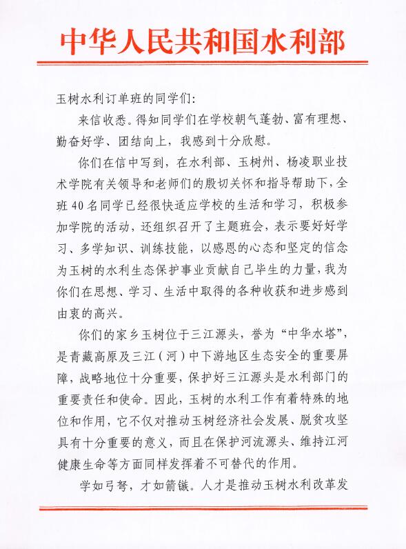 水利部陈雷部长给我院玉树水利订单班同学的回信
