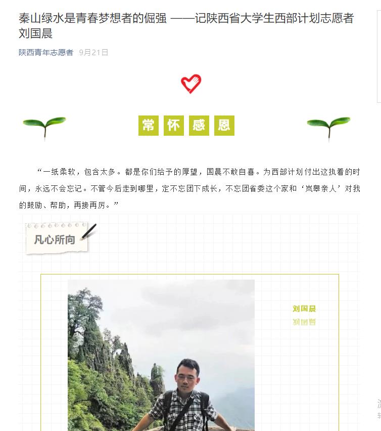 三年时间,收获满满,在工作岗位上经历磨砺,让刘国晨摆脱稚气,走向成熟。大山的魅力不言而喻,西部的魅力不言而喻。英国登山家乔治.马洛里曾经说过这样一句名言---因为山就在那里。参加大学生志愿服务西部计划,不仅仅是身份的变化,更是价值观的提升。因为我觉得现在,青春是用来奋斗的;将来,青春是用来回忆的。愿我们每个人都有大好的前程可奔赴,亦有难忘的岁月可回首。”